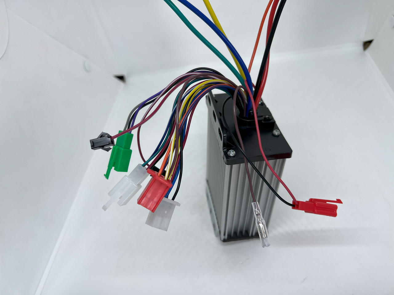 Виходу з контролера на мотор-колесо: із трьома окремими силовими проводами (жовтий, зелений, синій) та роз'ємом на датчики холу.